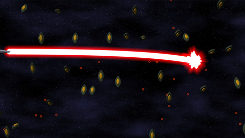 The beam itself actually locks on to targets and continually damages them. Implementation-wise, it’s a quadratic bezier. Initially, I tried to calculate the intersection of a quadratic-bezier-swept sphere (i.e. a thick bezier curve) and a bounding sphere exactly. That’s all great, only it becomes a quartic equation (ax^4 + bx^3 + cx^2 + dx + e == 0), which is ridiculously difficult to compute programmatically (just check the javascript source on this page to see what I mean). So I opted for another solution: