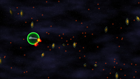 One design element that was tricky was signaling to the player that the ship is too close to a wall. The obvious metric is, of course, a shadow. However, standard shadows only cast in one direction, which would be great if all we cared about was distance to the floor. However, we really need “distance to any object.” This looks like a job for the existing lighting system!
